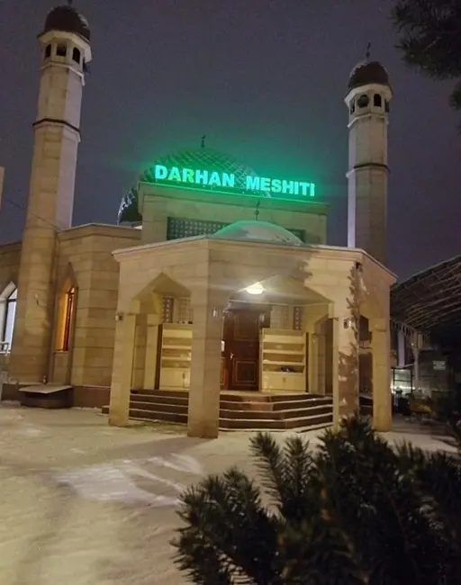 Мечеть “Дархан” расположилась в новом микрорайоне города Алматы, близ барохолки. Мечеть очень красивая, просторная, золотые купола, облицовка золотисто-бежевыми плитами, просторный двор со скамейками в тени еловых веток. Все это настраивает на благотворную молитву Аллаху.