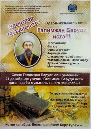 In the Palace of culture "Youth" in Kazan (street of Chemists, 11) Thursday, December 21, will be held a literary-musical evening "Galimdzhana Barudi in our hearts", dedicated to the year of a major religious figure, mufti G. baroudi. The program organized Almetyevsk muhtasibat: wagasa (sermons), a film about the life and work of G. Barudi, literary and theatrical composition with the participation of Shakirov, meeting with the relatives of the scientist, monajati.Beginning at 18.00, admission is free by ticket only.