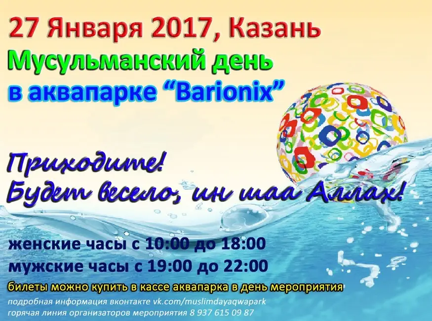The centre of Muslim tourism and recreation "RAKHAT-TOUR"™ invites you to visit another Muslim Day at the water Park "BARYONYX" (Kazan, Mazita Gafuri, 46), which will be held on January 27, 2017. 10:00-18:00 women's часы19:00-22:00 men's watch Attention! Mandatory Muslim dress code for men and women when you visit!More detailed information and tariffs you can get: call us 7 9376150987написав us: 7 (927) 039 05 98 (WhatsApp, Viber, Telegram)