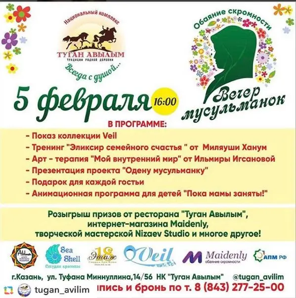 In the program: - display of a collection Veil: "the Elixir of happiness"- Art-therapy "My inner world"- Presentation of the project "a Muslim girl"- a Gift for each guests - Entertainment for children