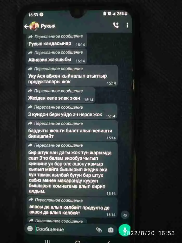 Саламатсыдарбы менин атым Рукыя жолдошум 1 жаш 4 айлык кызыбыз мн Москва шаарында турабыз койко местада жашайбыз Эл катары мен иштебейм кызым мн уйдо олтурам жолдошум иштеп бизден кредиттен акбасы ашпайт канча эконом кылсак дагы Кудайга шугур бизге жерип бизди ачка калтырбай багып жатат Кийим кече алып бербесе да, суротто корунгондой менин Бир тууган абжеме жардам керек болуп жатат бизде акча жагынан тартыш болгондуктан биз жардам Бере албай жатабыз кайрымдуулук фондунан суранып кетемин абжеме жардам берип коюнуздарчы сураныч, менин номериме чалсаныздар жакшы болот эле толугураак тушундурмо бермекмин ват ном +79685585293 связ,+79916497524