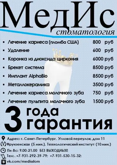 In St. Petersburg operates a dental clinic ” MEDIS” lowest prices in town. At our facility, highly qualified specialists . Treatment doctors men and women. Also the clinic has the ability to pay for dental services in installments. *Needy teeth with acute pain free Work is done using latest technology and modern materials. Directions: therapy surgery orthopedics orthodontics implantology periodontics aesthetic dentistry Approach to each individual patient) 79312923979 for men 79315311532 for women
